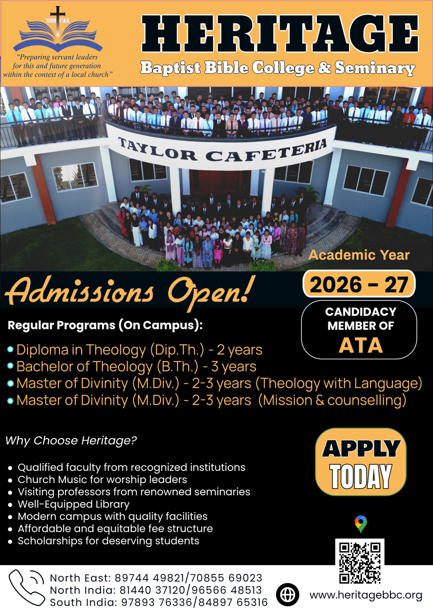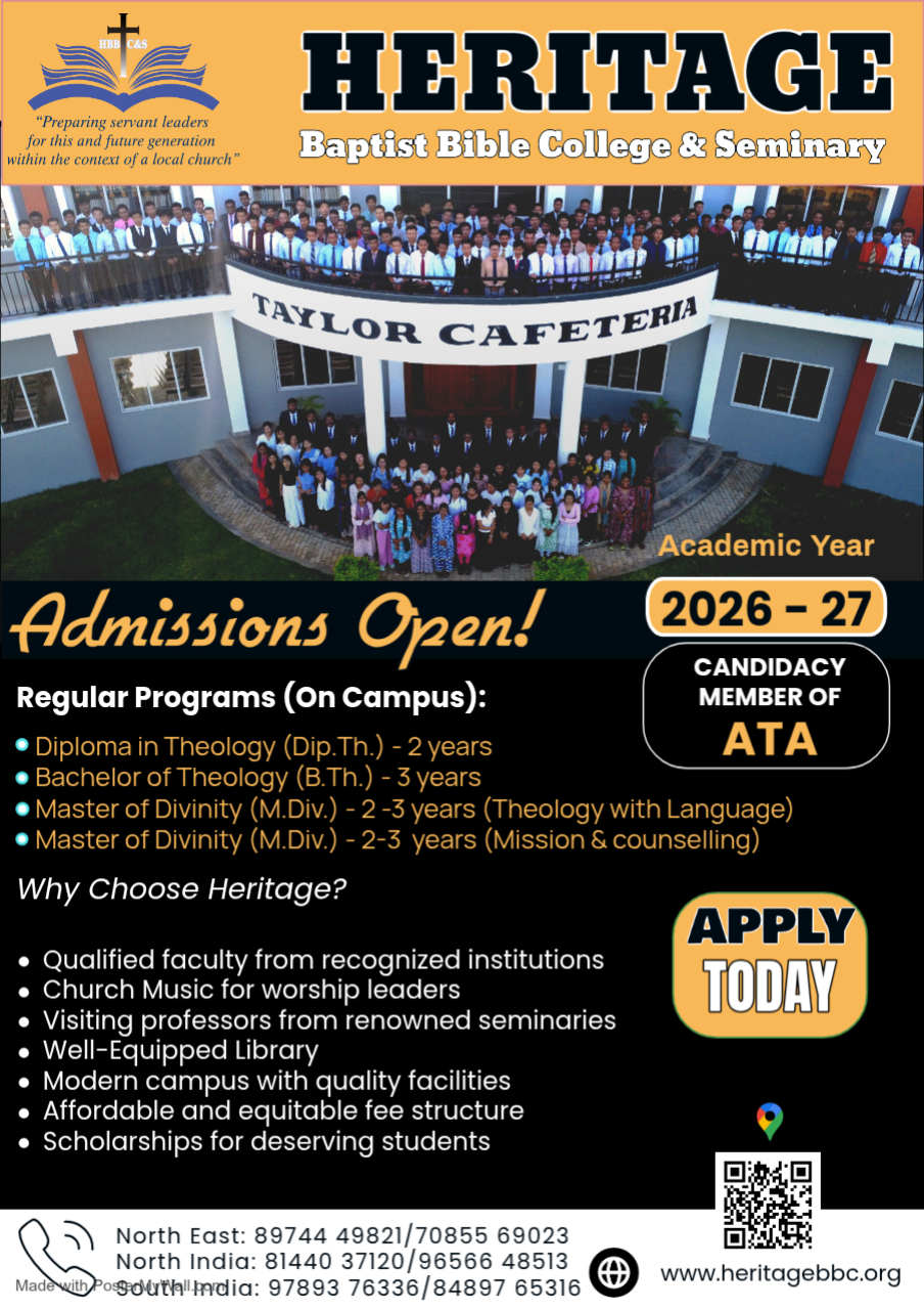 Tamil Nadu is the southernmost part of India with its ancient language and culture where St. Thomas the disciple of Jesus Christ came in the first century. It has the population of 76 Million and our Heritage Baptist Bible College & Seminary is located in the Rock Fort City of Tiruchirappalli which is the heart place of the State of Tamil Nadu.